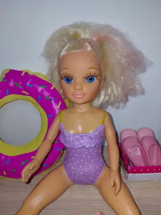 Set de dos muñecas Nancy con varios accesorios para vestir y jugar. - Incluye dos muñecas Nancy. - Accesorios de moda como ropa y zapatos. - Un flotador con forma de donut. - Un par de zapatillas rosas.