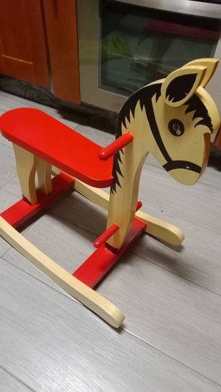 Caballo balancín de madera con asiento rojo. - Estructura de madera natural. - Asiento y detalles en color rojo. - Diseño de caballo con crin y orejas.