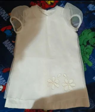 Vestido blanco de verano para niña, ideal para ocasiones especiales. - Tejido ligero y vaporoso. - Mangas abullonadas de organza. - Detalle de flores bordadas en la parte delantera. - Cuello Peter Pan.