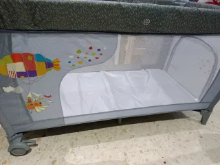 Práctica cuna de viaje para bebés, ideal para llevar a todas partes. Su diseño es ligero y fácil de montar. - Laterales de malla transpirable. - Estructura resistente con esquinas reforzadas. - Ruedas para facilitar el desplazamiento. - Diseño con motivos infantiles en tonos grises y azules.
