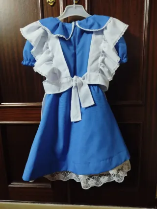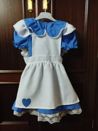 Disfraz de Alicia en el País de las Maravillas, ideal para niños de 3 a 4 años. El vestido es azul con un delantal blanco. - Vestido azul con cuello blanco. - Delantal blanco con corazón azul. - Mangas abullonadas. - Falda con encaje blanco.