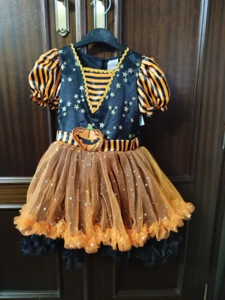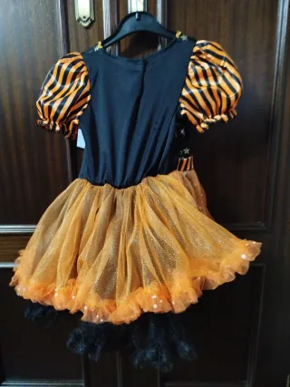 Disfraz de bruja para niña, talla 3-4 años. Perfecto para Halloween. - Diseño con estampado de rayas naranjas y negras. - Cuerpo negro con estrellas doradas. - Falda de tul naranja con brillo. - Detalle de calabaza en el cinturón.