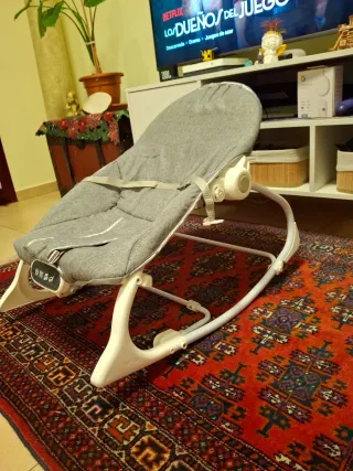 Hamaca para bebé en color gris, ideal para el descanso y entretenimiento. - Diseño moderno y acolchado. - Estructura resistente y segura. - Panel de control con iconos de vibración y música.