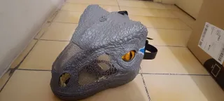 Máscara de dinosaurio con detalles realistas y un diseño llamativo. - Color gris con detalles en azul y amarillo. - Textura rugosa imitando la piel de dinosaurio. - Aberturas para los ojos y la boca.