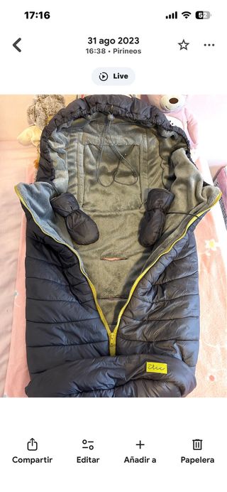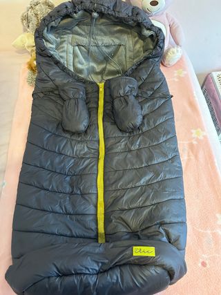 Saco de dormir para bebé de la marca Clic, ideal para mantener al pequeño abrigado. Muy poco uso. - Color gris. - Diseño acolchado. - Capucha con cordón ajustable. - Incluye manoplas. - Cremallera frontal amarilla. - Detalle de logo en la parte inferior.