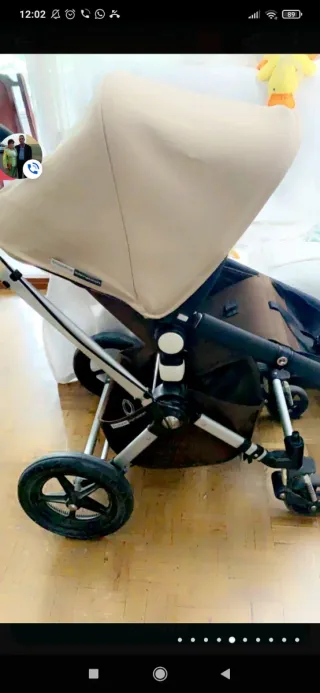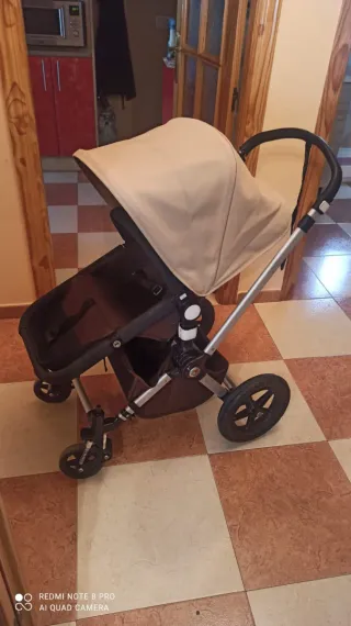 Silla de paseo con capota en color beige y estructura metálica. - Asiento reclinable. - Arnés de seguridad. - Ruedas todoterreno.