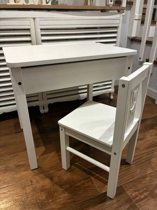 Pupitre infantil ikea con silla, tiene marcas de uso reparadas con retocador de laca blanco. Por lo demás perfecto.