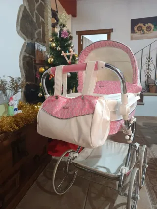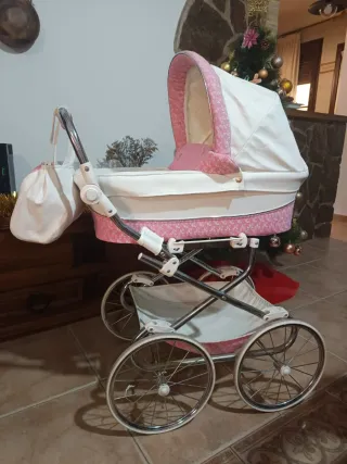 Carro de muñecas estilo clásico, ideal para reborn. - Estructura metálica cromada. - Capazo blanco con detalles en rosa. - Incluye bolso a juego. En perfecto estado