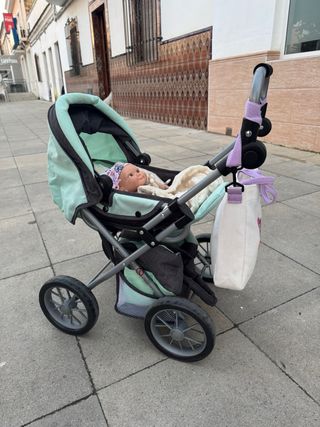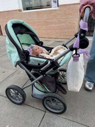 Precioso carro de muñecas reborn, ideal para coleccionistas o para jugar. - Color rosa con detalles en blanco y encaje. - Incluye capota, paraguas y bolso a juego. - Estructura resistente y ruedas blancas.