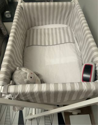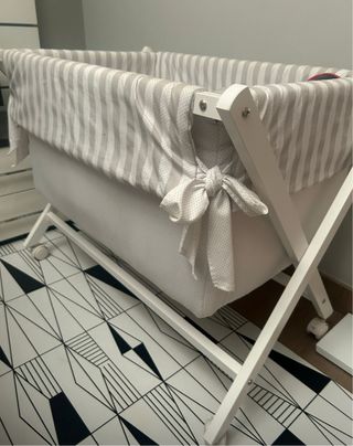 Minicuna con estructura de madera blanca y textiles a rayas grises y topos blancos. Incluye colchón. el colchón costó 70€ - Minicuna con ruedas para facilitar el movimiento. - Textiles con diseño a rayas y topos. - Colchón con tejido transpirable. con edredón