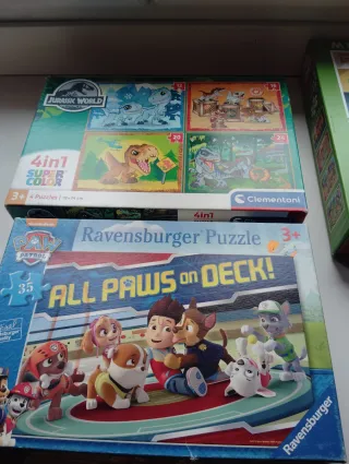 Lote de dos puzzles infantiles. Para 3 años. - Puzzle Ravensburger Paw Patrol All Paws on Deck de 35 piezas. - Puzzle Clementoni Jurassic World 4in1 Super Color con 4 puzzles de 12, 16, 20 y 24 piezas.