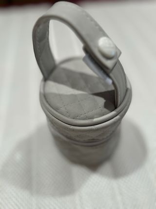 Práctico porta chupete en color gris, con un diseño acolchado. - Asa para colgar. - Cierre de botón. - Material suave al tacto.