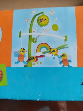 Móvil de cuna con un diseño alegre de abejas y arcoíris. Los elementos cuelgan de un soporte con música. - Figuras de abejas con alas. - Elemento central en forma de arcoíris. - Decoración con notas musicales.