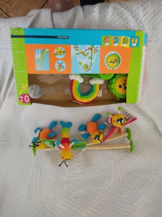 Gimnasio de actividades para bebés con varios juguetes colgantes. - Estructura de plástico y metal. - Juguetes de tela con diferentes texturas y colores. - Incluye un asa para facilitar su transporte.