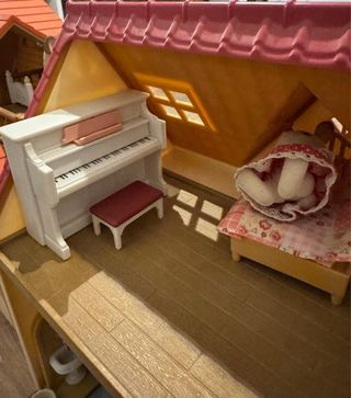 Casa de muñecas Silvanian Families con varias figuras y accesorios. - Incluye casa de dos plantas. - Figuras de conejos y perro. - Mobiliario variado: piano, cama, escritorio, mesa, sillas, baño y cuna.