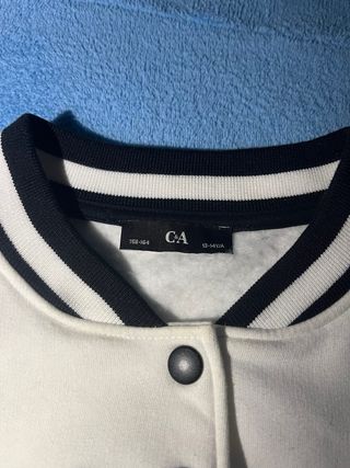 Marca: C&A 🏷️ • Estilo: Bomber / Varsity (Estilo universitario americano) 🎓🇺🇸 • Diseño: Contraste clásico en blanco y negro ⚪⚫ • Cierre: Botones de presión frontales en color negro 🔘