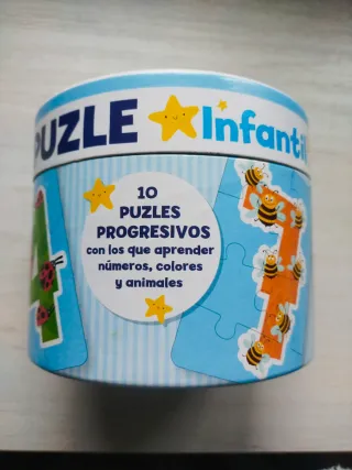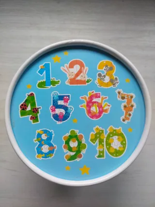 Divertido puzzle progresivo de números del 1 al 10, cada número está decorado con simpáticos animales. - Números del 1 al 10. - Ilustraciones de animales. - Diseño colorido sobre fondo azul.