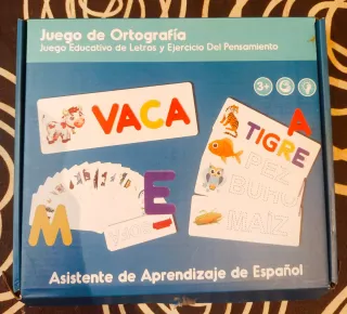 Juego educativo de letras y pensamiento para aprender ortografía en español. Incluye tarjetas con imágenes y letras de madera. - Ideal para niños a partir de 3 años. - Fomenta el aprendizaje del español. - Incluye letras y tarjetas de palabras.
