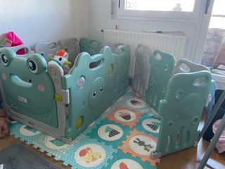 Parque infantil para bebés y niños pequeños, ideal para crear un espacio seguro en casa. Incluye suelo de goma EVA. - Diseño con figuras de animales. - Paneles de plástico resistentes. - Fácil de montar y desmontar.