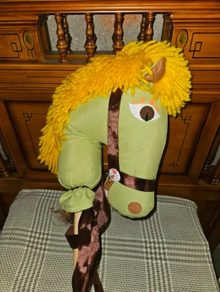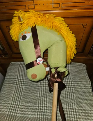 Caballo de peluche para niños, ideal para jugar. - Tela de color verde. - Melena amarilla de lana. - Riendas de cinta marrón. - Ojos decorados con detalles. - Se sujeta a un palo de madera. Lo puedo acercar a Ávila, Escorial, Villalba o Madrid o zonas cercanas. Preguntar