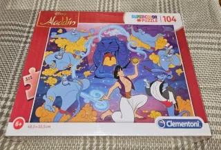 Dos puzzles de la marca Clementoni con licencia Disney de Aladdin. Incluyen 104 piezas cada uno. - Diseño Supercolor. - Tamaño: 48,5 x 33,5 cm. - Recomendado para mayores de 6 años. Es un pack precintado que une a dos puzzles. Lo puedo acercar a Ávila, Escorial, Villalba o Madrid o zonas cercanas. Preguntar