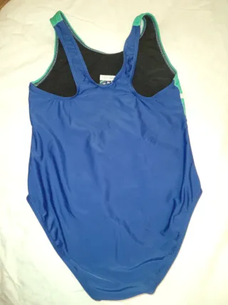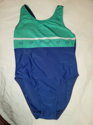 Bañador de uniforme del Colegio Punta Galea. Diseño a rayas con logo. Está nuevo. Me costó 39€. Talla 16 Comprado en septiembre 2025. Da muy poca Talla, equivale a una talla 8. - Parte superior verde con franja blanca y logo. - Parte inferior azul marino. - Tirantes anchos.