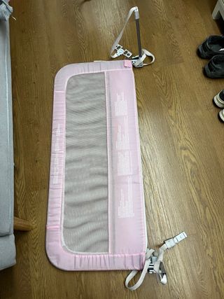 Barrera de seguridad para cama infantil en color rosa. - Diseño de malla transpirable. - Incluye correas de sujeción. 46 de alto y 108 cm de largo Con funda extraible y lavable