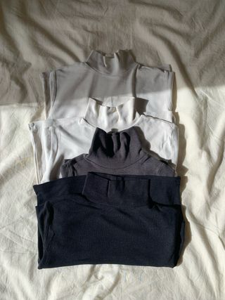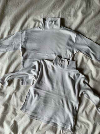 Pack de tres camisetas de manga larga con cuello alto para niño talla 92. Las blancas y negra 10% algodón de Zara. La gris con poliéster y algodón orgánico de H&M. Las blancas no tienen manchas.