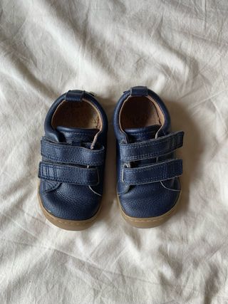 Zapatos infantiles de estilo respetuoso en color azul marino marca Poppis hechos en españa. - Cierre de velcro. - Suela flexible. - Material exterior de piel. Le falta la plantilla al pie derecho.