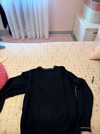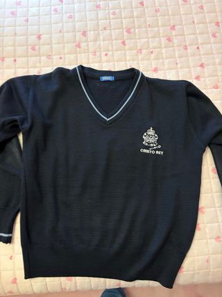 Jersey de uniforme escolar para Cristo Rey. Diseño clásico con cuello en V y detalles de ribete. Talla 10 - Color azul marino. - Escudo bordado en el pecho. - Cuello y puños con ribete gris.
