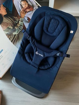 Hamaca Ergobaby Evolve en color “midnight blue” . Diseñada para la comodidad del bebé. - Tejido acolchado y suave. - Arnés de seguridad de 3 puntos. - Base gris con diseño ergonómico.