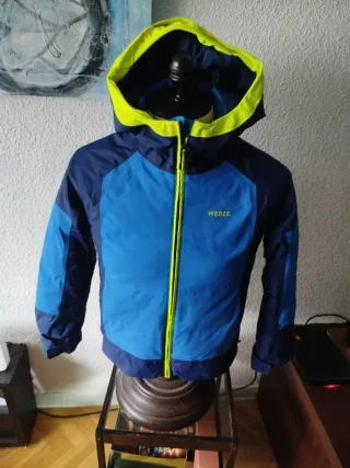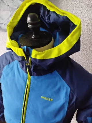 Chaqueta de abrigo para niño, ideal para la nieve y el esquí. Diseño bicolor en azul y azul marino con detalles en amarillo. - Marca: Wedze - Capucha integrada - Cierre de cremallera frontal - Mangas largas Usada 1 vez