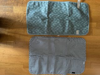 Dos cambiadores portátiles, uno de la marca Cambrass y otro de Walking Mum. Ideales para llevar en el bolso o mochila. - Cambiador Cambrass con estampado de cuadros blanco y negro. - Cambiador Walking Mum con estampado geométrico en tonos verdes y beige. - Ambos incluyen una cinta para cerrarlos y transportarlos cómodamente.