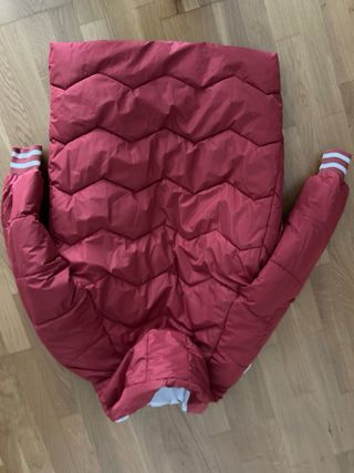 Chamarra de invierno para niña en color rojo. Cuenta con capucha y cierre frontal. - Diseño acolchado. - Bolsillos frontales con botón. - Puños con rayas. - Bolsillo adicional en manga.