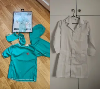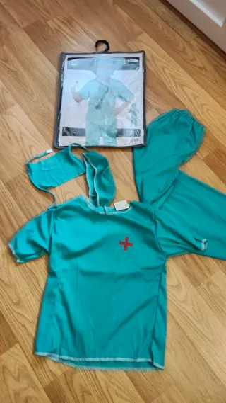 Disfraz de médico para niños, ideal para juegos o fiestas. Talla 7/9 - Incluye gorro, camiseta y pantalón. - Camiseta de color verde con cruz roja. Bata blanca talla 10
