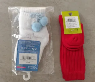 Lote de dos pares de calcetines para bebé. Un par es blanco con pompones y el otro es rojo.A estrenar . No quedo en persona,sólo hago envíos. Por favor,no escribir para intentar quedar.