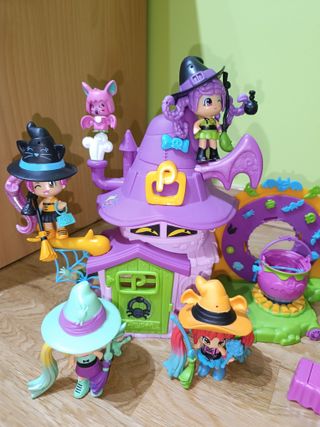Set de juego de la Casa de las Brujas de Pin y Pon. Incluye varias figuras y accesorios. - Casa con temática de brujas. - Figuras de brujas y un animalito. - Accesorios como escobas y calderos.