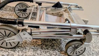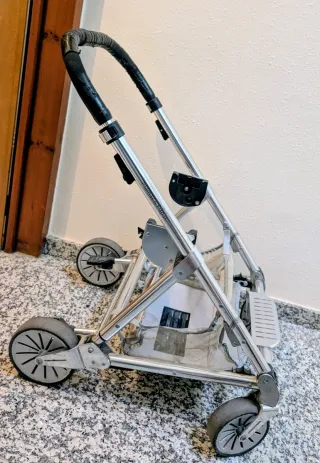Cochecito Mamas & Papas modelo Urbo. Un diseño elegante y funcional. - Estructura de metal pulido. - Ruedas con diseño. - Asa negra. - Incluye cesta de tela. - Super plegable. Totalmente plegado son 50cm de ancho, 80 de largo y 27 de alto por lo que cabe en maleteros pequeños. -Mango telescópico que permite el ajuste en altura. - Conjunto completo con Maxi-Cosi, Cuco y silla de paseo. - Todos los elementos permiten ser instalados fácilmente para que el bebé vea a los padres o en dirección frontal. - Incluye los plásticos protectores para el bebé en caso de lluvia. - Algún desgaste visible en la empuñadura. - Entrega en persona.