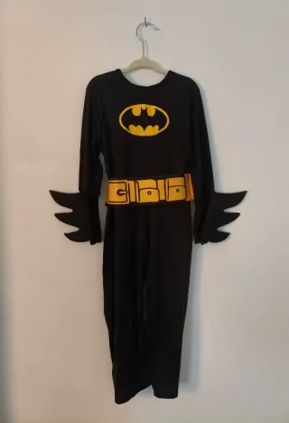 Disfraz completo de Batman, listo para la acción. - Mono negro con el logo de Batman en amarillo en el pecho. - Cinturón amarillo con detalles. - Capa con alas de murciélago.