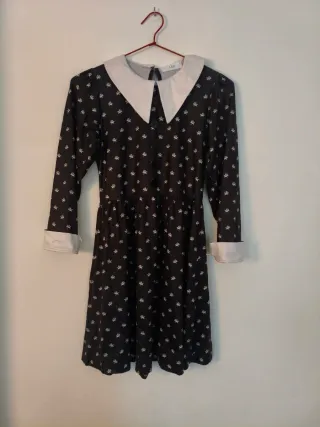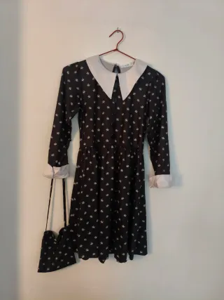 Disfraz inspirado en Miércoles Addams, perfecto para fiestas temáticas o Halloween. Incluye vestido y bolso. - Vestido negro con estampado blanco. - Cuello blanco grande. - Puños blancos. - Bolso a juego con estampado blanco.