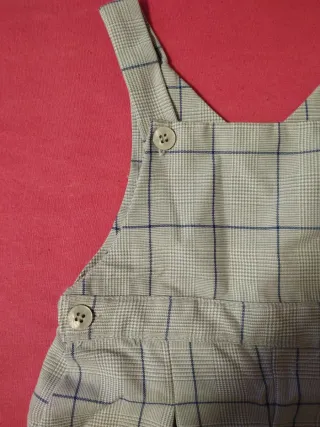 Precioso peto para bebé con un diseño de cuadros. - Estampado de cuadros en tonos grises y azules. - Tirantes con botones. - Detalle de pliegues en la parte delantera. - Corte tipo bombacho en la parte inferior.