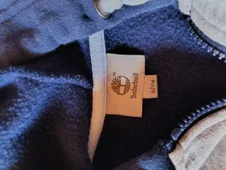 Chaqueta con capucha para niño de la marca Timberland. Combina un cuerpo gris jaspeado con mangas y capucha en azul marino. - Cierre completo con cremallera. - Bolsillos delanteros. - Logo de Timberland en la manga.
