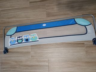Barandilla de seguridad para cama infantil con un divertido diseño de búhos. - Color azul y turquesa. - Estructura de tela y malla. - Incluye el logo de la marca OLMITOS.