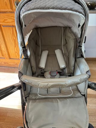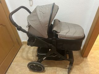 Carrito de bebé y silla de coche en color beige y negro. El carricoche lo use muy poco casi nuevo, la sillita de coche si tiene más uso. - Capazo amplio y cómodo. - Silla de paseo reversible. - Chasis ligero y plegable. - Incluye portavasos.