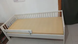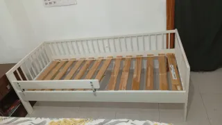 Cama infantil de color blanco, ideal para habitaciones de niños. - Estructura de madera. - Barrera de seguridad lateral. - Somier de lamas de madera.