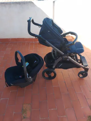Conjunto de carrito de bebé y silla de coche a juego, en color azul marino. - Silla de paseo con capazo. - Silla de coche para bebé. - Marca Peg Perego.