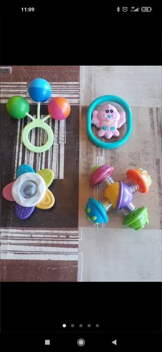 Lote para los primeros meses del bebé compuesto por: - 5 sonajeros - 8 baberos medianos - 3 baberos grandes - 8 chupetes - 1 par zapatitos - 2 dosificadores de leche - 1 cepillo limpiabiberones Todo en buen estado.