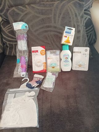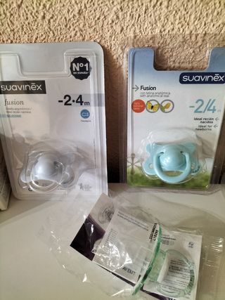 Lote de bebé recién nacido, compuesto por: 2 chupetes suavinex 2-4 meses (uno de látex y otro de silicona), 1 chupete Philips Avent 0-2 meses de silicona, 1 chupete Nuk 0-6 meses de silicona, 2 tetinas suavinex de látex (era 1 pero yo metí otra sin estrenar de regalo), 1 cepillo limpiabiberon y tetina, 1 par de calcetines, 1 pack de 2 gorritos y 2 manoplas, y de regalo 1 bote de leche hidratante Nenuco. Todo sin estrenar, excepto la leche hidratante, que estará como a la mitad o más. Más artículos de bebé en mi perfil.