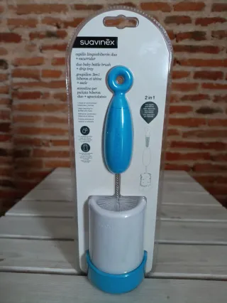 Práctico cepillo limpiabiberones de la marca Suavinex con escurridor. - Diseño duo para biberones y tetinas. - Incluye base escurridora. - Color azul y blanco.