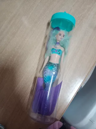 Muñeca Barbie sirena con cabello largo y ondulado en tonos lila y turquesa. Lleva un top brillante con estrellas y una cola de sirena escamada. - Colores principales: lila y turquesa. - Detalle de estrellas en el top. - Cola de sirena con escamas brillantes. Se conserva en el embalaje original, prácticamente nueva, muy poco uso